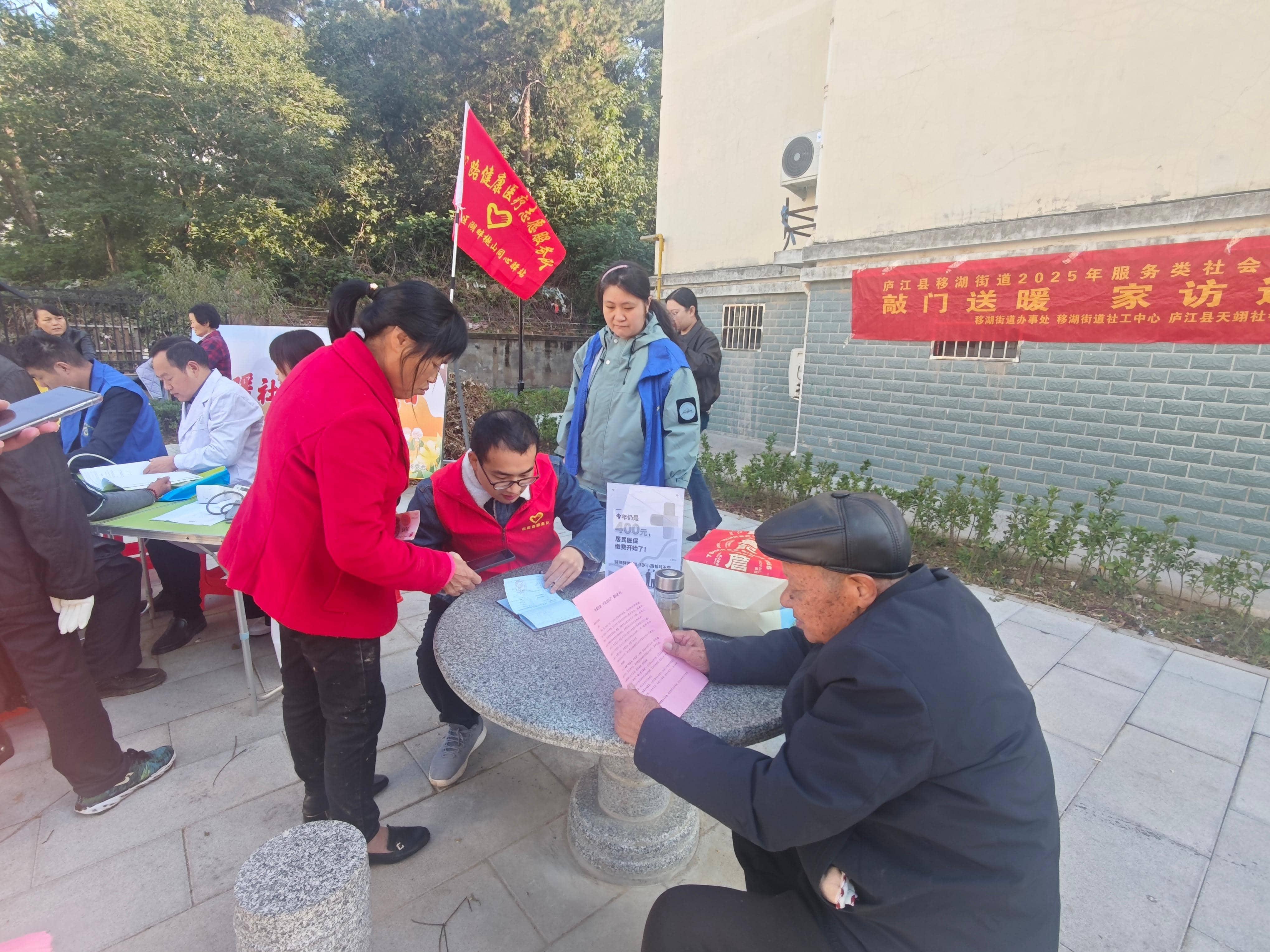 在重阳节来临之际,为弘扬尊老敬老传统美德,做实做细社会救助服务,10月29日上午,在庐江县移湖街道社会事务部的指导下,庐江县天翊社会工作服务中心携手移湖社区、移湖社区卫生站、宇豪物业,共同举办了2025年“敲门送暖,家访连心”社会救助服务项目的第五场便民公益活动,将温暖与关怀送到老人身边。